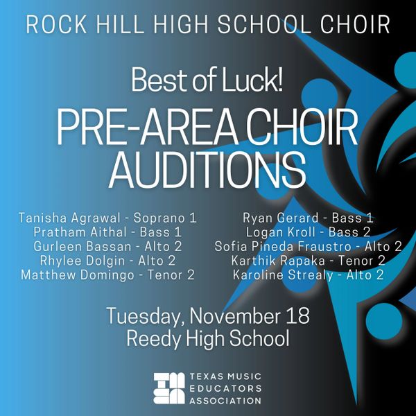 Best of luck to our 10 Pre-Area Audition candidates as they audition another round of Texas All-State music at Reedy HS on Tuesday. With each audition, they inch their way closer to the prestigious Texas All-State Choir in February, 2026. May their audition literature be musical and their sightreading be accurate!