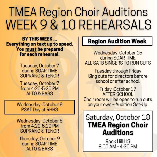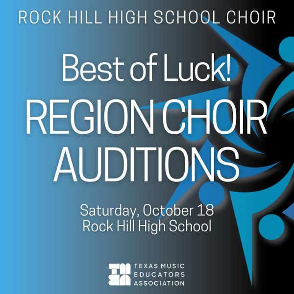Students in the Rock Hill choir program are encouraged to participate in TMEA Region and State TMEA auditions. This extra opportunity will allow students to prepare quality choral music through several audition rounds, develop sightreading skills, and build artistry through detailed preparation.